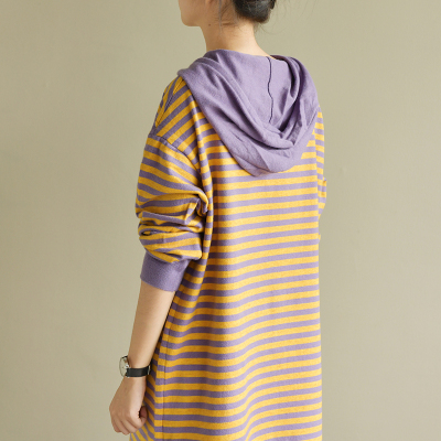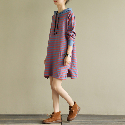Sản phẩm tự nhiên Trà trái cây Váy sọc trùm đầu lỏng lẻo trong đoạn văn dài một màu tương phản trang phục giản dị đầm xòe trung niên