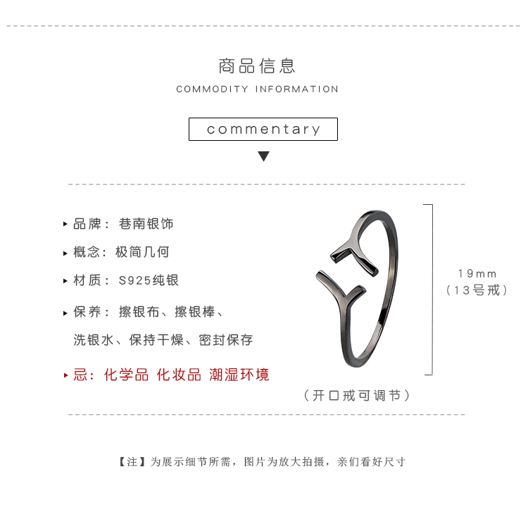 [South Lane] Cây bạc đen đơn giản 925 sterling 丫 nhẫn văn học Nhật Bản và Hàn Quốc chữ Y mở vòng quà tặng nữ sinh viên nhẫn nam