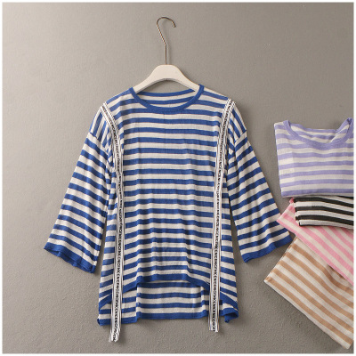 Taotao quần áo mùa hè mới chín- điểm tay áo sọc cao đàn hồi vòng cổ áo thun áo len phụ nữ 55044 quần áo nữ hàng hiệu Áo / áo thun