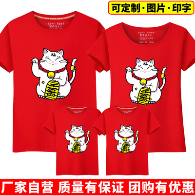 Tết đỏ may mắn mẫu mèo bố mẹ-con mặc áo thun ngắn tay một gia đình ba mẹ con cotton mùa thu đông đầy nhà. quần áo trẻ em cao cấp