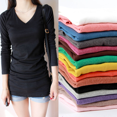 Thu đông 2017 phiên bản Hàn Quốc mới của áo thun cotton kẻ sọc cổ chữ V dài cổ áo Slim dài tay áo thun hông dài áo sơ mi áo phông nữ đẹp