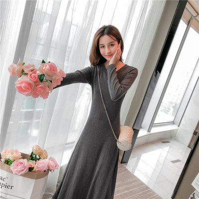 Thu đông 2018 phiên bản Hàn Quốc của khí chất mới dài tay Slim mỏng dài mảnh đáy váy váy dài Một váy chữ váy chữ a cho người béo