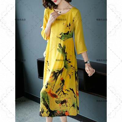 Tide new 2019 của phụ nữ một từ con lắc lớn in lỏng tay áo lụa bảy điểm váy dài lụa - A-Line Váy mẫu đầm xòe hoa đẹp nhất A-Line Váy