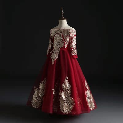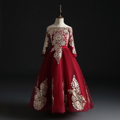 Trẻ em váy công chúa cô gái sinh nhật dài tay từ hoa vai cô gái đám cưới trang phục piano đỏ mùa thu và mùa đông quan ao tre em