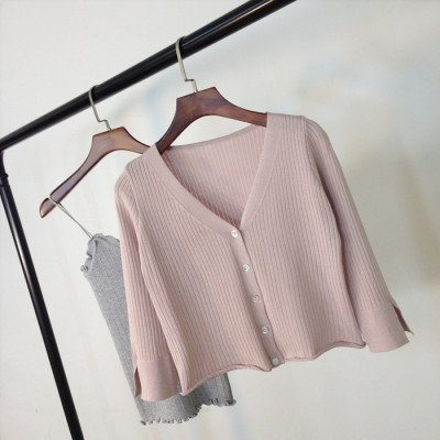 V-cổ mở ngã ba trumpet tay áo len băng lụa cao eo của phụ nữ mỏng bên ngoài điều hòa không khí áo 7 điểm tay áo ngắn tay dài áo khoác áo len nữ hàng hiệu Cardigan