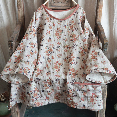 Văn học gốc vườn hoa Áo thun cotton 7 tay và vải lanh phụ nữ rộng kích thước tay áo kèn nhỏ áo sơ mi ngắn - Áo phông áo phông nữ rộng