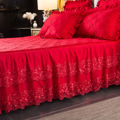 Váy cưới lớn màu đỏ bông trải giường ba mảnh cotton đôi 1,8m trải giường cotton dày thêu ren trải giường - Váy Petti ga giường viền họa tiết Váy Petti