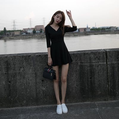 Váy đen nữ Hàn Quốc mùa hè 2019 mới phong cách Hepburn Phiên bản Hàn Quốc với kiểu dáng thon thả thon gọn cổ chữ V một chiếc váy - A-Line Váy mẫu váy xòe đẹp 2020