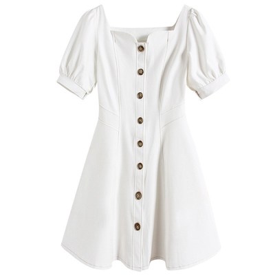 Váy liền thân màu hè 2019 lưới đỏ Hàn Quốc đơn nữ cổ vuông vuông ngực ngắn tay váy suông - A-Line Váy váy xoè dài A-Line Váy