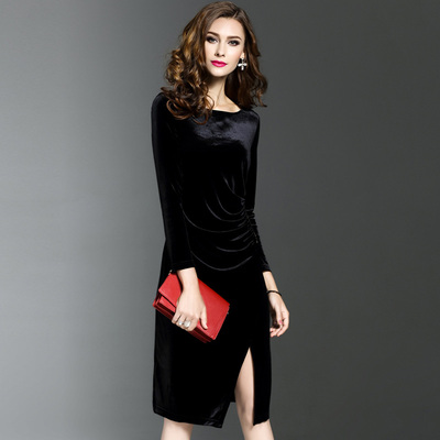 Váy mùa thu mới 2017 của phụ nữ nhung nữ dài tay thon thả váy dài eo eo váy váy váy 2 dây dáng dài Váy dài