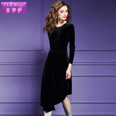 Váy nhung mơ Philippines mùa thu 2018 mới dài tay xếp li thon dài không đều một chiếc váy nữ - A-Line Váy đầm xòe công chúa cao cấp