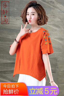 Váy thêu hoa cotton và vải lanh nữ 2019 mới mùa hè áo sơ mi rộng 30 - 40 tuổi - Áo phông áo phông nữ có cổ