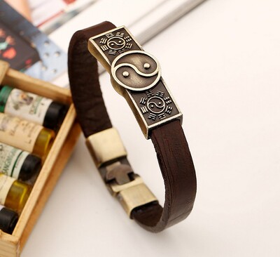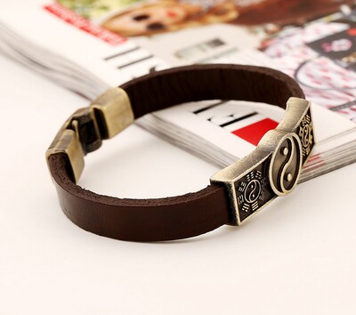 Vòng đeo tay nam bằng da Phụ kiện da châu Âu và Mỹ Da nâu Vòng đeo tay hợp kim Phụ kiện Yin Yang Tai Chi thạch anh tóc xanh Vòng đeo tay Cuff