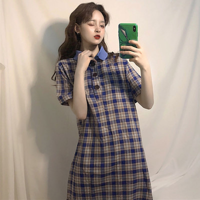 Xia 2018 mới của phụ nữ dài váy kiểm tra ngắn tay áo váy eo lỏng kẻ sọc váy polo cổ áo váy thủy triều đầm thun suông dài qua gối