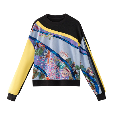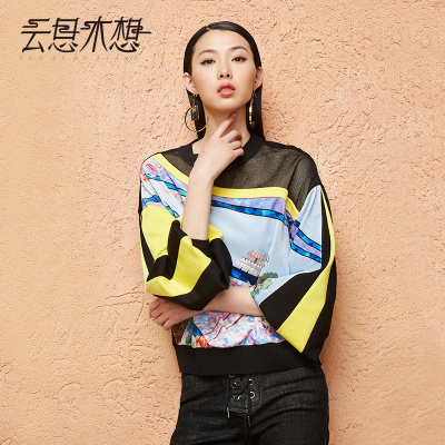 Yunsimu muốn các walker silk road in ấn 2018 mùa thu khâu mới đèn lồng tay áo nhung áo len phụ nữ 05437 áo khoác lót lông nữ Áo len