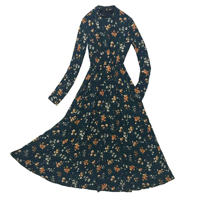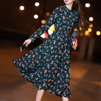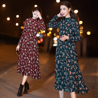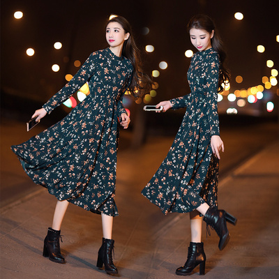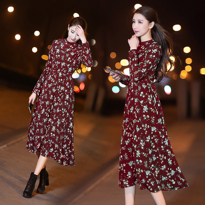 2018 mùa thu mới dài tay áo voan hoa in retro cổ cao cộng với cơ sở nhung dài quần áo phụ nữ chân váy đen