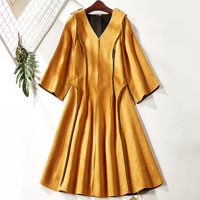 2018 thu đông mới thời trang khí chất V-cổ khâu tay dài thon gọn nữ 17168 chân váy jean váy đầm