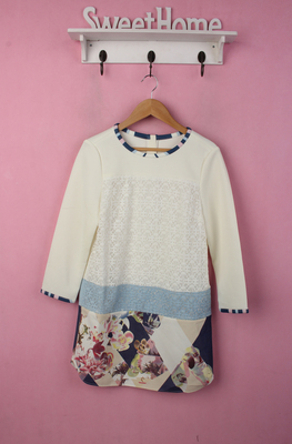 57X * 078 Phụ nữ kéo cổ cắt mùa xuân và mùa thu bộ giản dị của cổ tròn tay áo dài khâu váy quần váy váy đầm