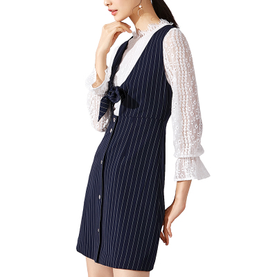 [66 nhân dân tệ] 2018 khí chất mới cổ chữ V sọc nơ mỏng dây đầm một chiếc váy nữ váy xòe ngắn liền thân