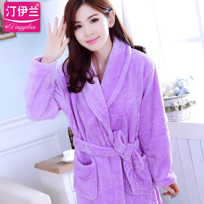 Áo ngủ nữ dày flannel mùa thu và áo choàng mùa đông của phụ nữ cotton dài tay nhung san hô dễ thương màu tím phần dài đồ ngủ hình thú