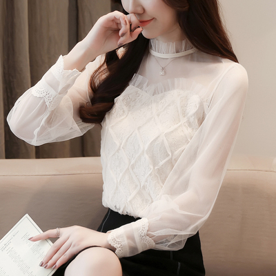 Áo sơ mi nữ lưới mùa thu 2018 mới Hàn Quốc quần áo dài tay ren voan nữ mùa thu áo sơ mi caro nữ form rộng Áo sơ mi chiffon ren