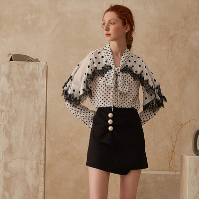 Áo thun chấm bi voan nơ thắt nơ 2018 mùa thu mới ren xù cổ chữ V nữ cổ rộng áo sơ mi trắng nữ công sở