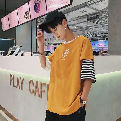 Bf phong cách cá tính theo xu hướng nam giới quần áo trẻ trung lỏng lẻo hip hop tay áo rộng bảy điểm tay áo ngắn tay áo áo thun form rộng nam
