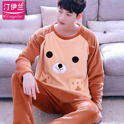 Bộ đồ ngủ nam phục vụ kích thước lớn phù hợp với flannel dày tay dài nhung san hô mùa thu và mùa đông phiên bản Hàn Quốc dễ thương của phim hoạt hình - Bộ Pajama đồ bộ pijama nữ lụa Bộ Pajama