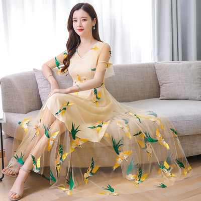 Đầm lưới rộng 2019 hè mới thời trang nữ thêu siêu dài váy dài thêu hoa khí chất - Váy dài đầm suông dài qua gối trung niên