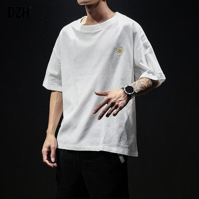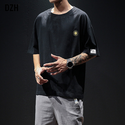 DZH nam mùa hè đầm năm điểm tay áo thêu rắn màu áo thun nam lỏng lẻo cotton mùa hè tay ngắn nam xu hướng thương hiệu - Áo phông ngắn áo thun nam cotton