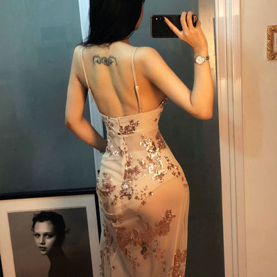 Hộp đêm gợi cảm đính sequin cổ chữ v chia chéo lưới thêu váy cổ tích váy công chúa đầm mùa hè váy lụa váy đầm