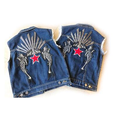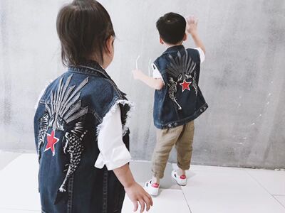 Mô hình vụ nổ INS 19 người đàn ông và phụ nữ mới trẻ em quần áo trẻ em thêu áo vest cá mập đá không tay áo khoác denim - Áo ghi lê quần áo trẻ em nam