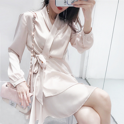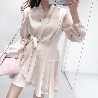 Mùa hè 2018 mới Hàn Quốc dài tay eo cao thon gọn với khí chất cổ chữ V xù lông rắn rỏi váy xếp ly