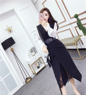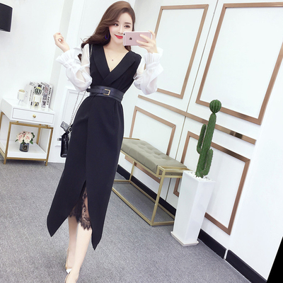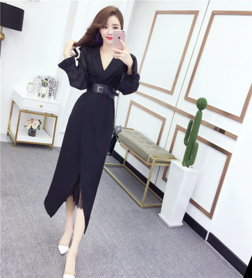 Mùa thu 2018 nữ thời trang V-cổ khí chất tay dài chia ren dài thon thả thon nữ đầm váy đuôi cá váy đầm