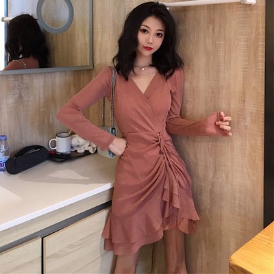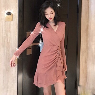 Mùa thu 2018 phong cách mới Hồng Kông hương vị sang trọng chéo V-cổ dây rút ren sequin Một chiếc váy đuôi cá váy đầm nữ mẫu váy thu đông 2021 váy đầm