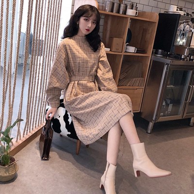 Mùa thu mới thắt eo lỏng lẻo một từ váy trong phần dài thời trang kẻ sọc retro váy dài tay nữ chân váy dài hàn quốc