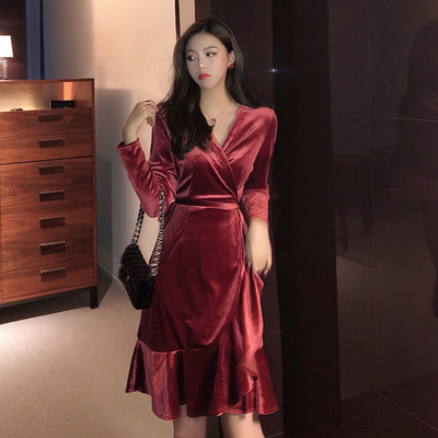 Mùa thu và mùa đông mới Hàn Quốc retro chic hoang dã nhung đáy váy dây đeo eo thon dài tay áo nữ váy jean