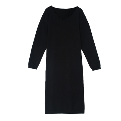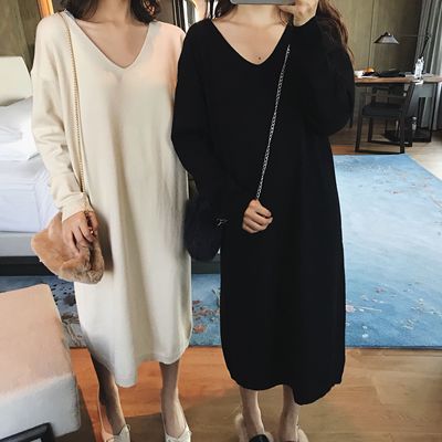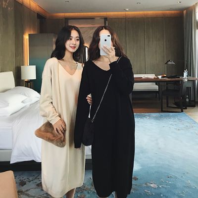 Nhà của chị gái 2018 bạn gái mới mặc áo dài cổ chữ V nữ mùa xuân và mùa thu dài tay đan váy đen váy đầm