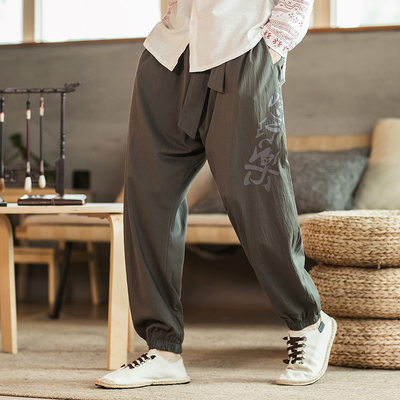 Quần áo nam phong cách Trung Quốc chân quần harem quần nam cải tiến quần dài Trung Quốc quần thường ren thắt lưng in cá nhân - Quần mỏng quần ngắn