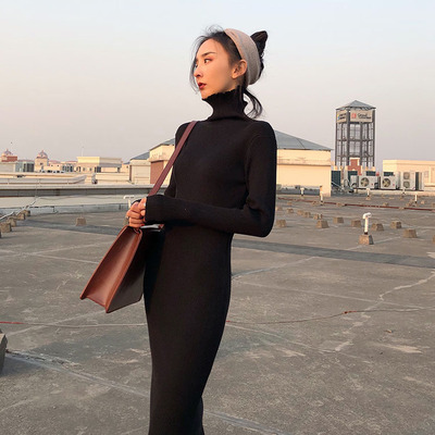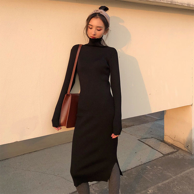 Thu đông 2018 phiên bản Hàn Quốc mới của chiếc áo len cổ cao thanh mảnh, váy dài tay sang trọng retro xẻ đáy váy nữ váy trung niên